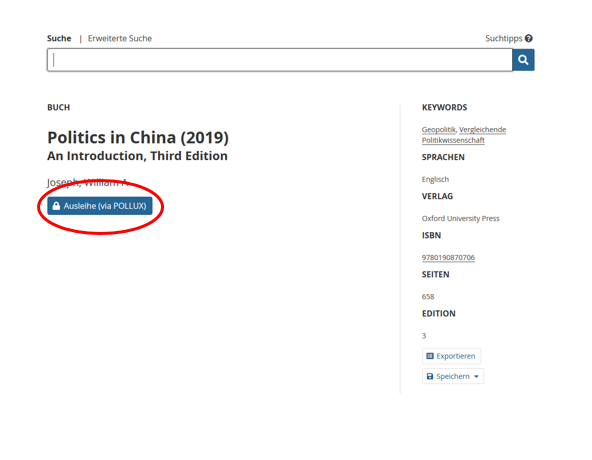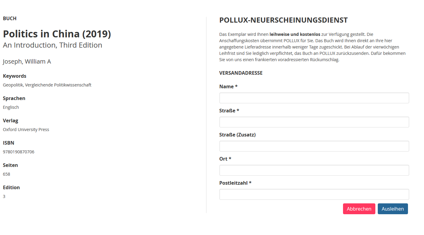 Ab sofort können registrierte Politikwissenschaftlerinnen und Politikwissenschaftler direkt in POLLUX neue Bücher kostenfrei zur Ausleihe bestellen. Dafür wählen wir laufend politikwissenschaftliche Neuerscheinungen aus zahlreichen fachrelevanten Verlagen aus. Alle Neuerscheinungen werden über die Suche in POLLUX angezeigt und sind an dem Button Ausleihe (via POLLUX) erkennbar. Die Anschaffungskosten übernimmt POLLUX für Sie. Das Buch wird Ihnen dann so schnell wie möglich direkt an die von Ihnen angegebene Lieferadresse zugeschickt. Nach Ablauf der vierwöchigen Leihfrist sind Sie lediglich verpflichtet, das Medium an POLLUX zurückzusenden. Dafür bekommen Sie von uns einen frankierten voradressierten Rückumschlag.
